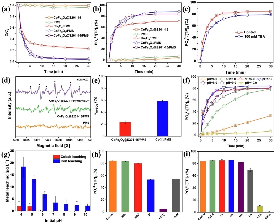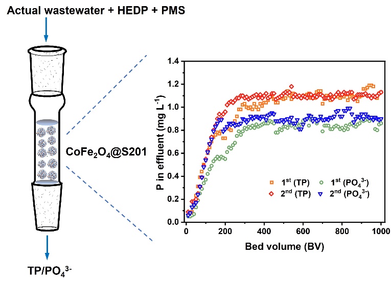 该研究以强碱性阴离子交换树脂D201为载体,通过溶剂热法制备了CoFe2O4@S201催化剂;考察了CoFe2O4@S201@S201活化过一硫酸盐(PMS)降解有机膦酸过程中反应条件和溶液化学性质(pH、共存离子和天然有机物)对目标污染物降解效果的影响;重点关注其催化氧化机制及固定床实验过程中催化剂在实际废水处理中的性能及稳定性。研究表明,CoFe2O4@S201@S201活化PMS降解有机膦酸的主要活性氧化物种为Co(II)-PMS络合物,对水体基质的干扰较小。此外,在连续流和固定床实验中,以实际废水中有机膦酸为目标污染物,CoFe2O4@S201@S201催化剂均具有优异的催化性能和稳定性。