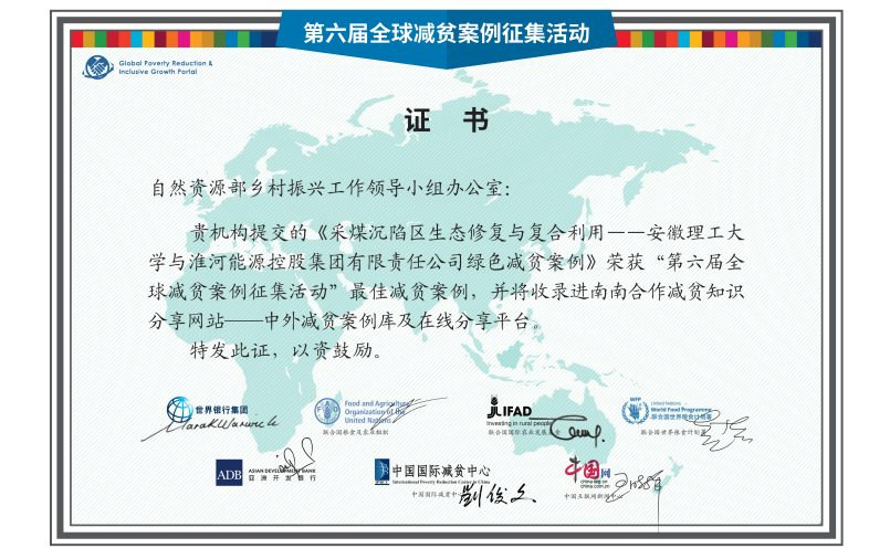 近日,由联合国粮食及农业组织、联合国世界粮食计划署、世界银行、国际农业发展基金和亚洲开发银行、中国国际减贫中心、中国互联网新闻中心等七家机构联合发起的第六届“全球减贫案例征集活动”评选结果揭晓,共有108个案例入选。袁亮院士牵头,学校环境学科团队与淮河能源控股集团有限责任公司合作完成的《采煤沉陷区生态修复与复合利用——安徽理工大学与淮河能源控股集团绿色减贫案例》入选并荣获“最佳减贫案例”,并被收录于南南合作减贫知识分享平台——中外减贫案例库及在线分享平台。