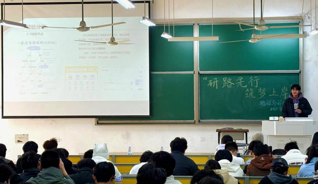 为扎实推进“一站式”学生社区学业支持服务体系建设,助力学生成长成才,地球与环境学院于2025年12月28日在教学楼举办“研路先行,筑梦上岸”研究生推免经验交流会。活动邀请付晋源、曹西发、薛梓贤、陶慧玲四位已推免的2022级同学担任主讲,将优质分享送到学生身边。学院2023级本科生同学参加讲座。