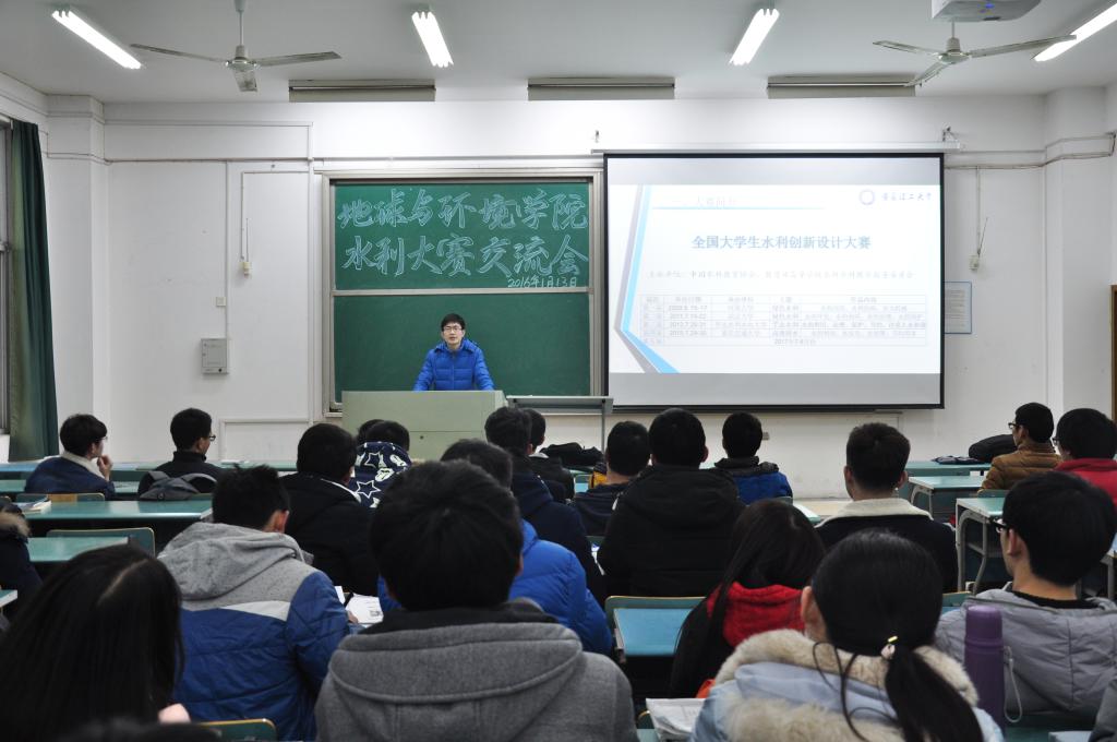 1月13日晚,地球与环境学院在北实401教室举办水利创新设计大赛交流会。第四届全国大学生水利创新设计大赛一等奖获得者舒生茂向2014、2015级水文与水资源专业全体同学传授了参赛经验。