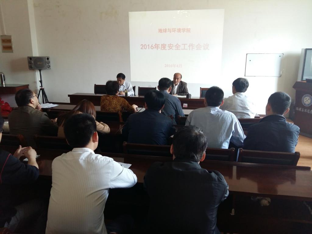 4月22日上午,地球与环境学院在201会议室召开2016年度安全工作会议,学院领导班子成员、各系主要负责人、各党支部书记、学生辅导员和实验员参加会议。会议由党委书记盛鹏飞主持。