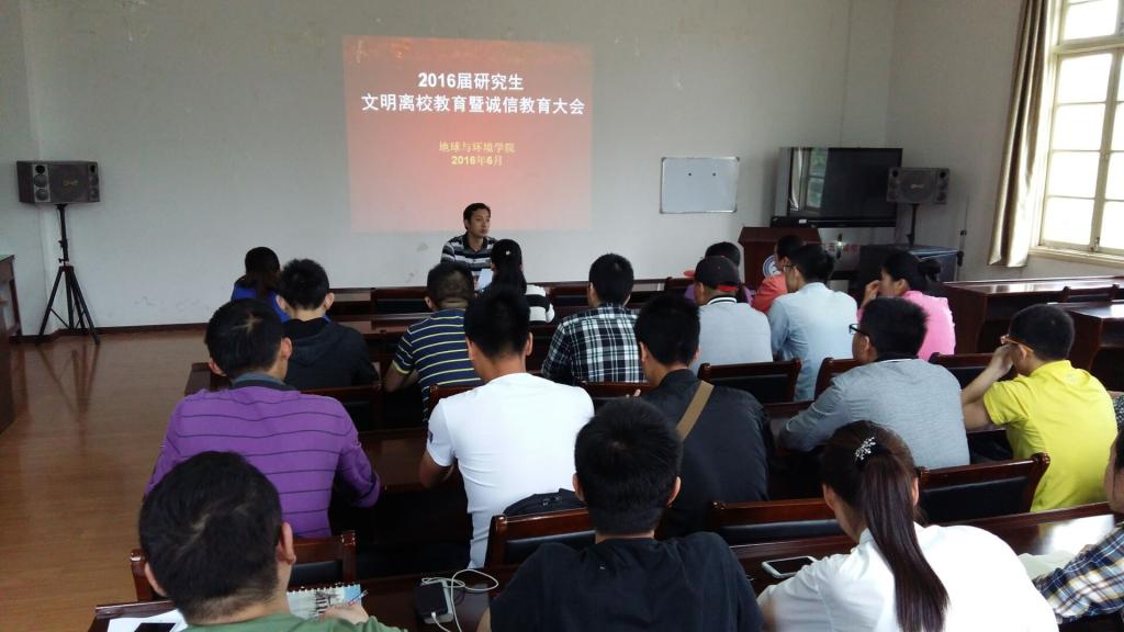 6月3日上午,地球与环境学院在院201会议室召开2016届研究生文明离校暨诚信教育大会。学院党委副书记、研究生辅导员侯辉主持大会,学院2016届全体研究生参加会议。