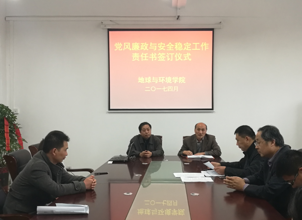 4月7日下午,地球与环境学院组织签订党风廉政和安全责任书。院领导、各系主任、院办各室负责人、辅导员和实验员参加了签订仪式。