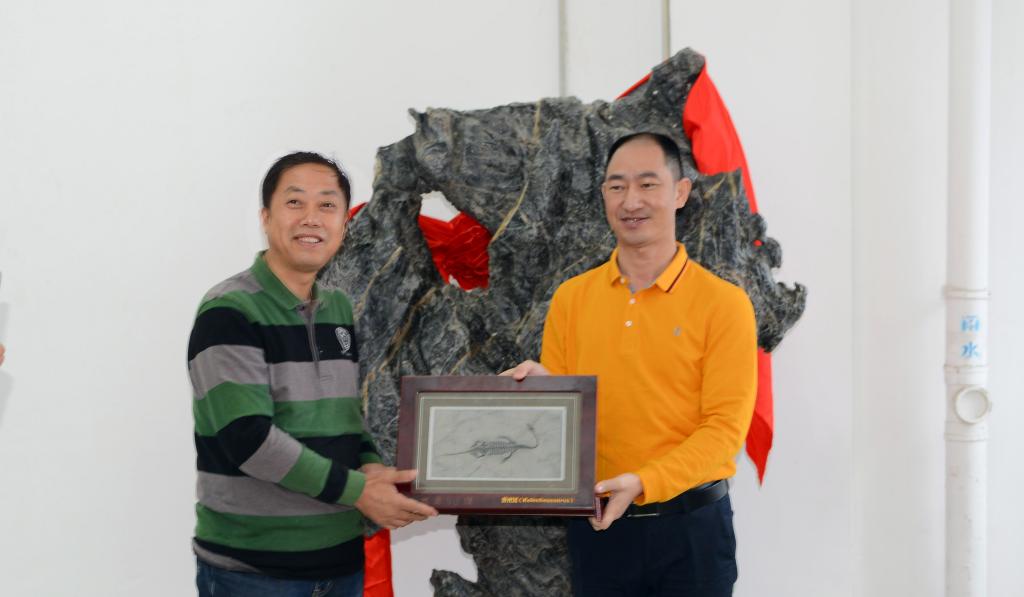 座谈会结束后大家合影留念,随后举行了97届校友向学院捐赠灵璧石和贵州龙化石的仪式。