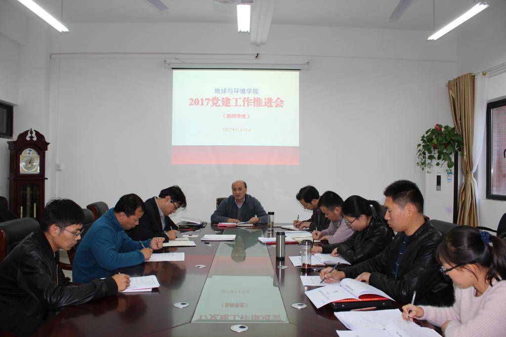11月10日下午,地球与环境学院党委在静远楼406召开2017年度第四季度党建工作推进会。院党委书记盛鹏飞主持会议,各党支部书记参加会议。
