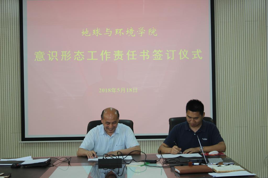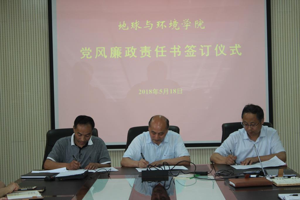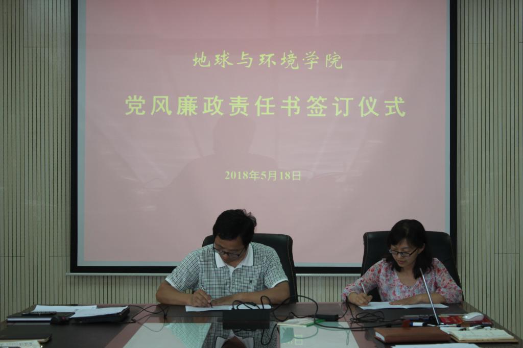 5月18日下午,地球与环境学院组织签订2018年度党风廉政、意识形态工作和保密工作责任书。院领导、各系主任、各党支部书记、科级干部、辅导员参加了签订仪式。