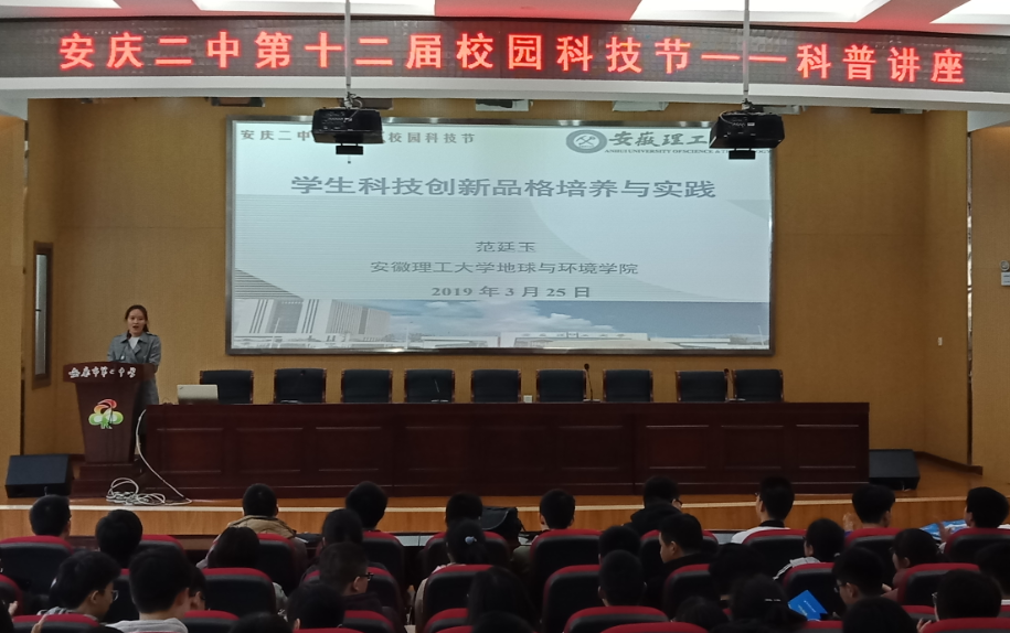 学院环境与给排水工程系主任范廷玉为安庆市第二中学师生作了题为“学生科技创新品格培养与实践”的报告。毕业于安庆市第二中学的我校环境工程专业2017级学生王孔嘉、安全工程专业2016级学生周可凡进班级向母校师生汇报了在安徽理工大学的学习与生活情况,并介绍我校优秀的办学条件、优美的校园环境以及学校的奖助体系、本硕博培养模式等情况。