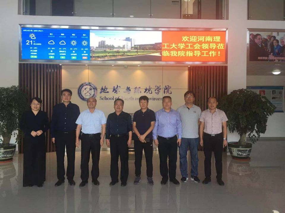 2019年9月24日,河南理工大学校工会主席田留轩一行3人到安徽理工大学校工会地球与环境学院分工会调研,校工会主席李广田、学院党委书记盛鹏飞等陪同。