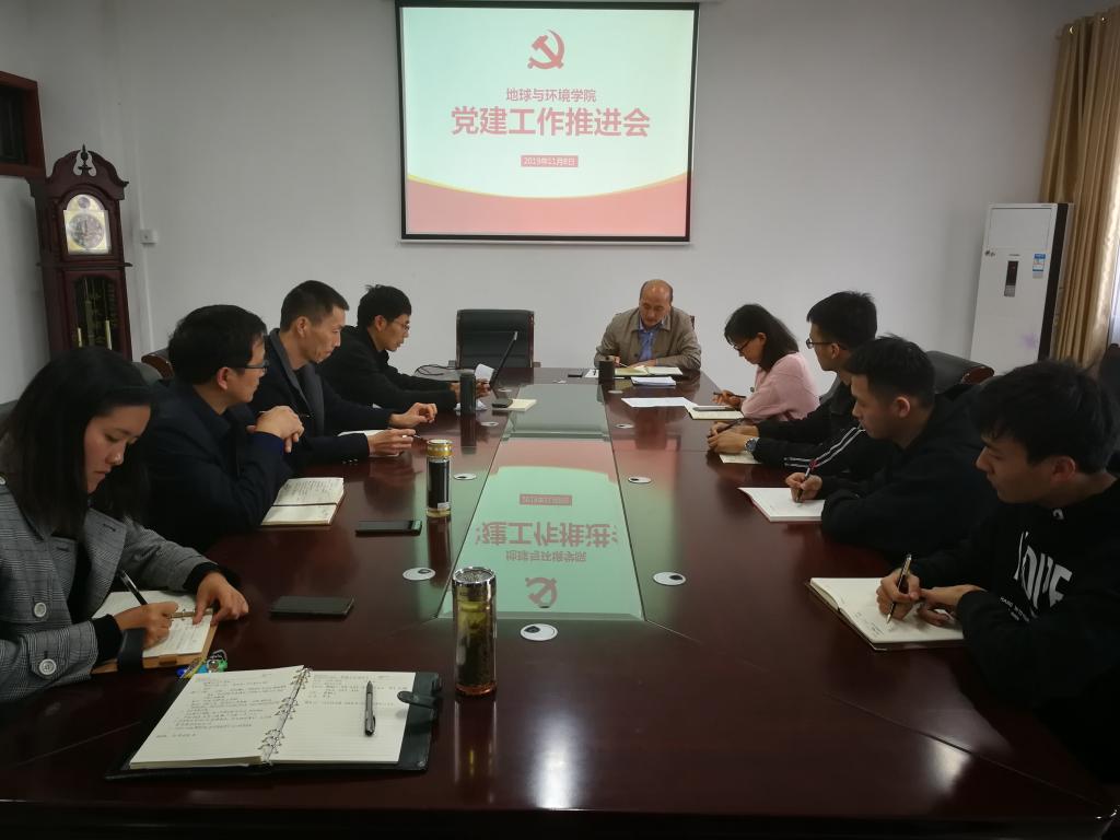 11月8日下午,地球与环境学院党委在静远楼B408召开“不忘初心、牢记使命”主题教育专题党建工作推进会议。学院党委委员、各党支部书记参加会议,会议由院党委书记盛鹏飞主持。