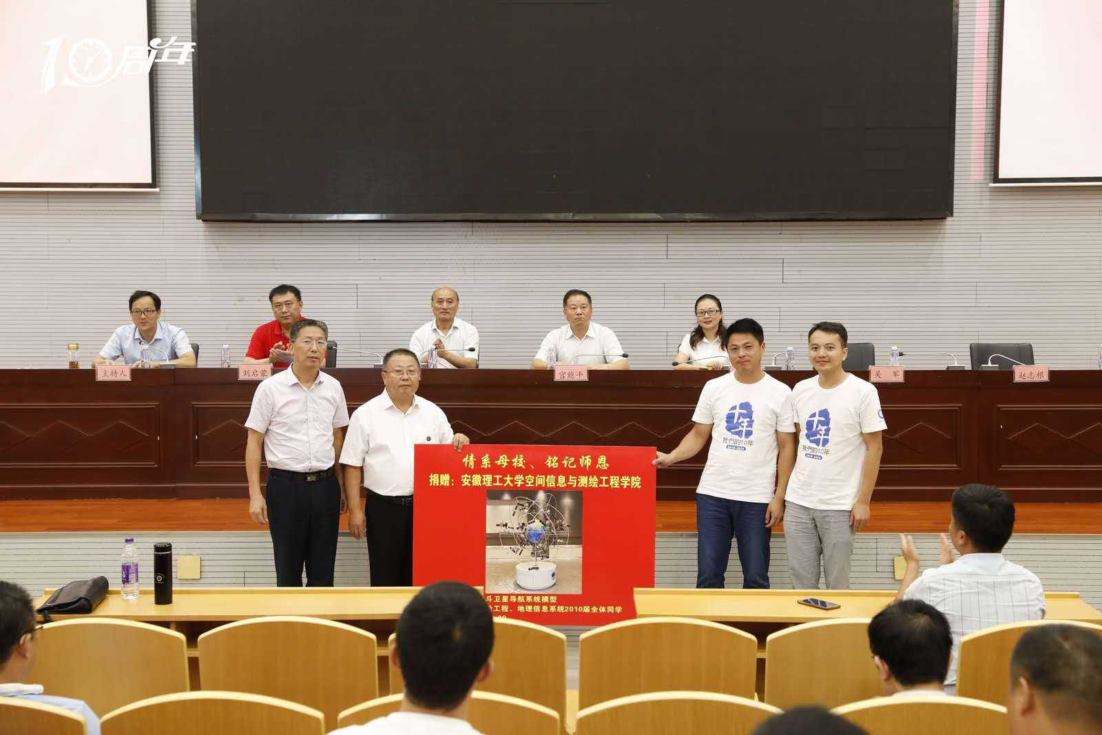 地球与环境学院党委书记盛鹏飞代表两个学院致欢迎词,向校友们介绍了两个学院发展过程中的历史渊源,结合母院十几个“第一”和“首个”标志性事件或人物,介绍了学院建设发展的历程、取得的成绩以及传承的文化精神。地球与环境学院副院长(主持工作)刘启蒙和空间信息与测绘工程学院院长赵志根分别在座谈交流时介绍了学院学科建设、人才培养、师资队伍、对外交流等发展现状。来自各专业的校友代表分别汇报交流了专业同学十年以来的学习、工作和生活情况,表达了对母校和师长深深的思念与感恩之情,并为母校捐赠了一座珊瑚石灰岩、一座方解石晶族、216套动植物标本和一座北斗科教模型。