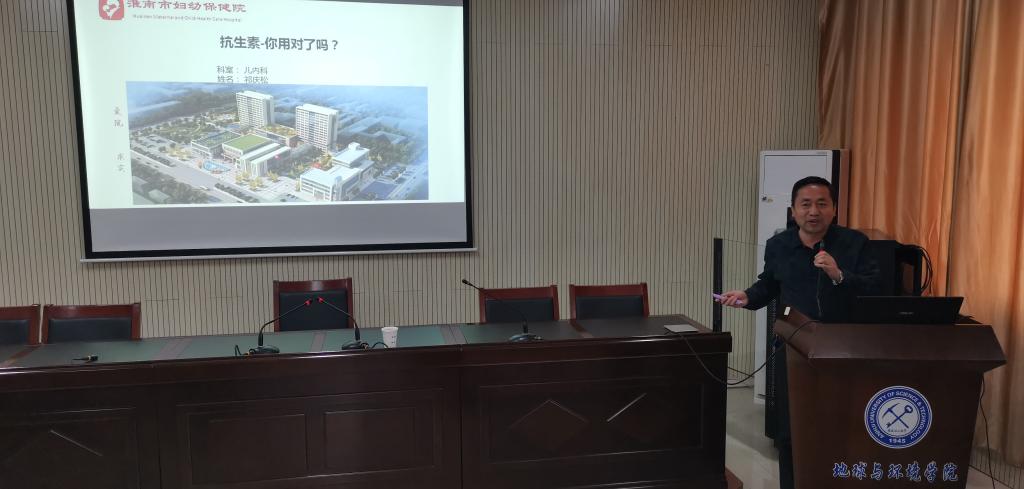 4月27日下午,应校工会、地球与环境学院分工会的邀请,淮南市妇幼保健院儿科副主任祁庆松为我校师生做了题为《抗生素,你用对了吗?》的健康知识讲座,讲座由校工会副主席陈忠琴主持。