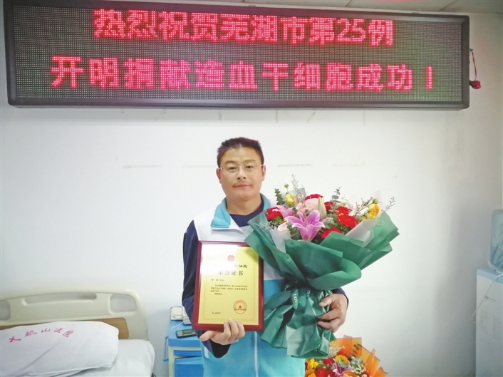 12月28日在芜湖弋矶山医院,地球与环境学院99级地质工程专业校友,中共党员,芜湖市勘察测绘设计研究院高级工程师开明圆满完成造血干细胞采集,成为芜湖市第25位造血干细胞捐献者。
