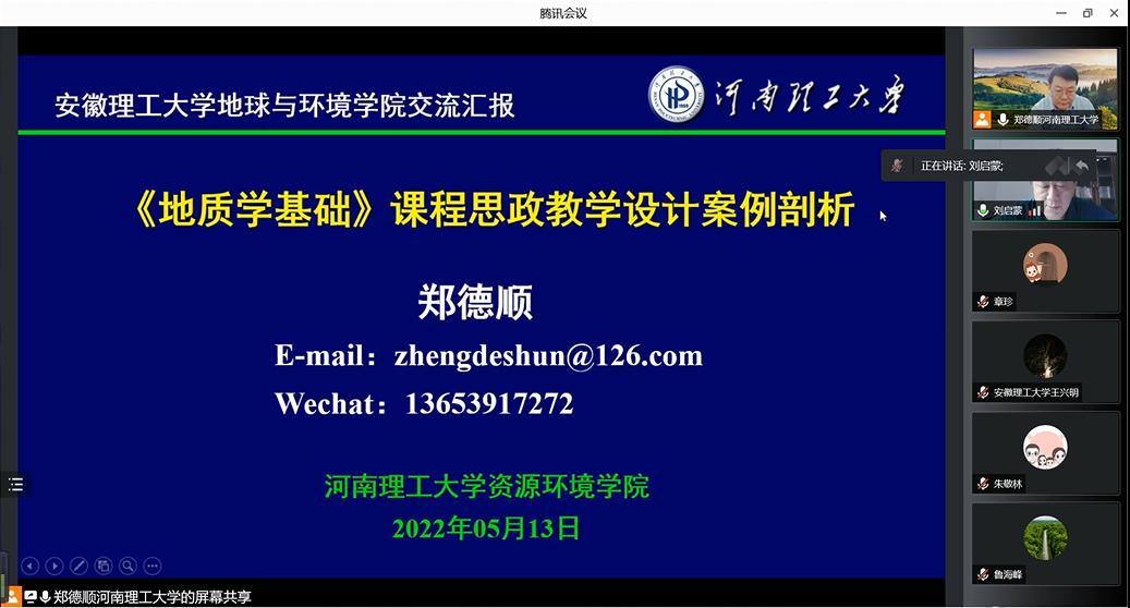 5月13日上午,河南理工大学资源环境学院副院长郑德顺教授应地球与环境学院邀请,做了“《地质学基础》课程思政教学设计案例剖析”的线上辅导报告。学院近50位青年教师参与了观摩和研讨,院长刘启蒙主持报告会。