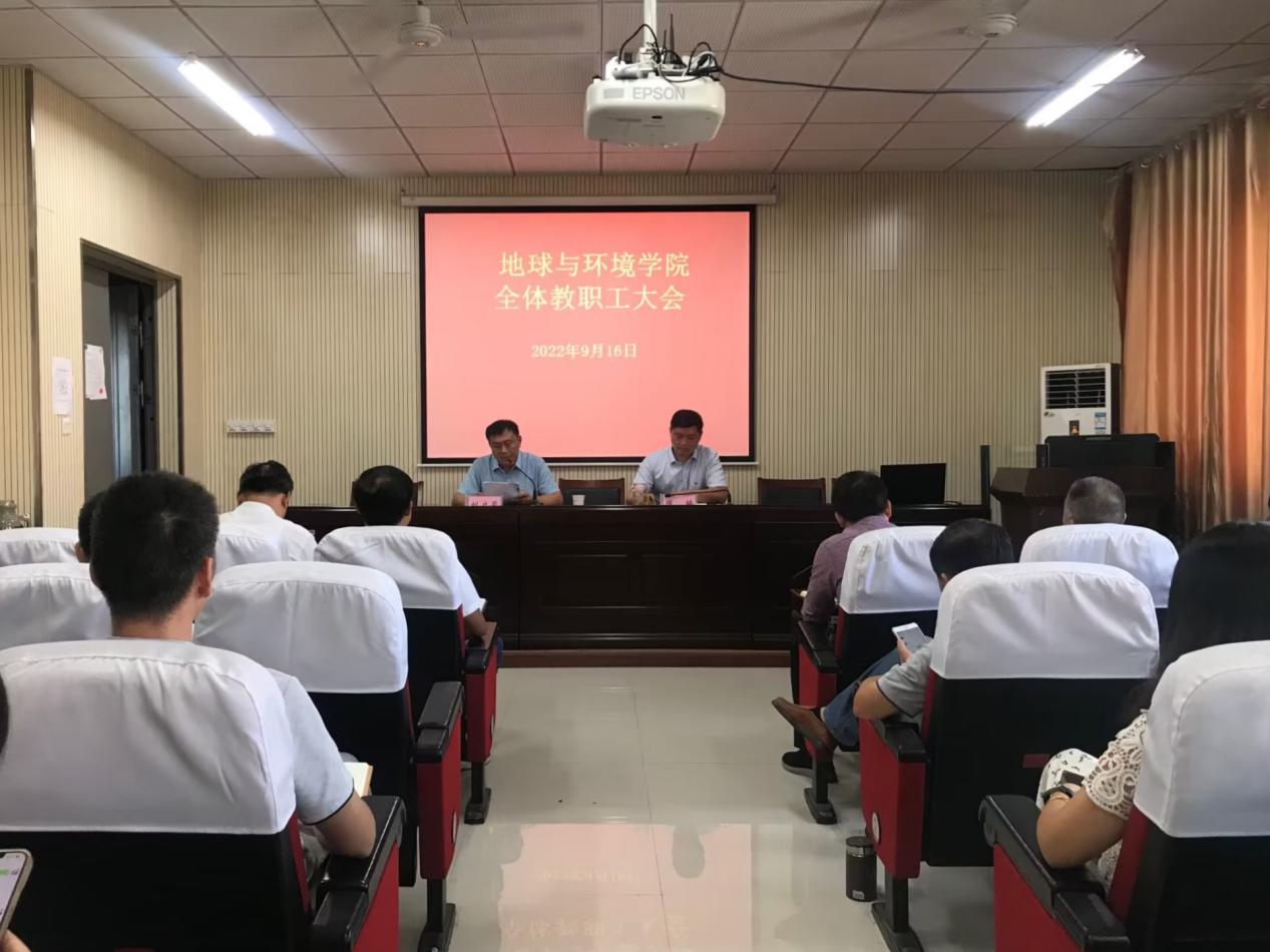 9月16日下午,地球与环境学院于B406会议室召开2022年全体教职工大会,对照党政工作要点总结学院上半年和暑期工作,安排部署下半年重点工作。学院领导班子成员、全体教职工参加会议,会议由学院党委书记陈楠主持。