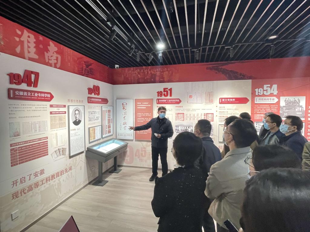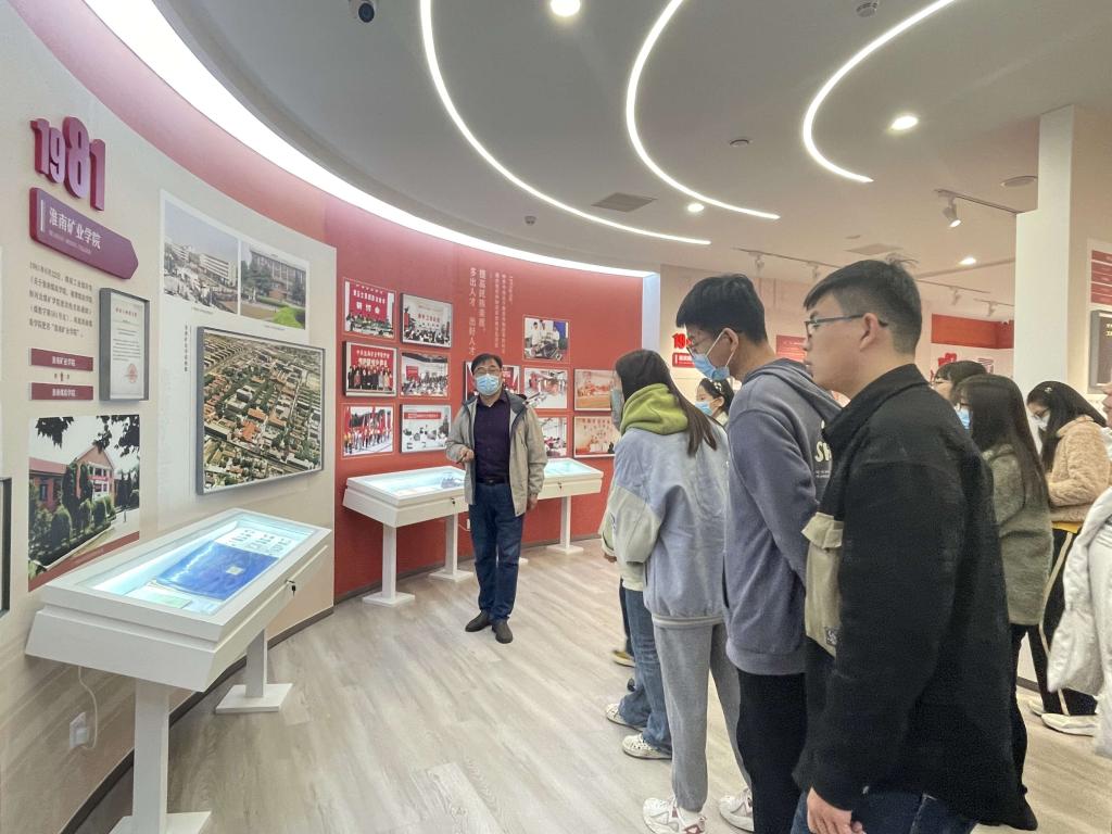 党员师生参观了校史馆两大展厅六个版块,回顾了从1945年安徽省立蚌埠高级工业职业学校、1947年安徽省立工业专科学校、1958年合肥工业大学、1971年淮南煤炭学院到今日安徽理工大学这77年来学校的光辉历程与成就。