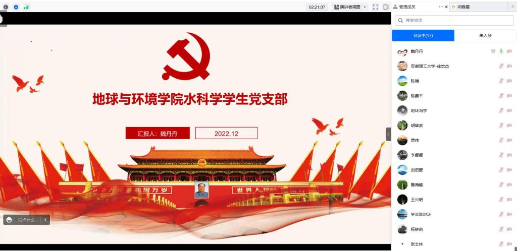 12月22日晚,地球与环境学院线上召开党支部书记抓党的建设工作述职评议会议。学院党委委员、各党支部书记和师生代表参加会议。会议由学院党委书记陈楠主持。