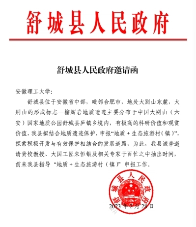2日下午,举行了欢迎会。会上,薛潇对调研组一行的到来表示热烈欢迎,期望双方在地质文化村(镇)申报和建设方面开展务实合作,并表示县政府将全力支持中国地质文化村(镇)申报工作。詹汪林详细介绍了舒城县的经济概况、自然景观和人文历史,以及庐镇乡境内的地质遗迹情况和古银杏树、安菜等自然资源情况,最后还特别感谢了学校对舒城县乡村振兴工作的支持。