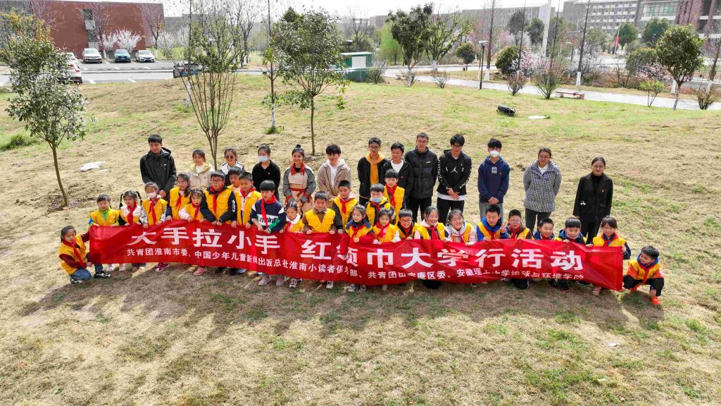 “什么是双碳?”“这是什么石头?”3月12日,在中国水日来临之际,时值植树节,由共青团淮南市委、淮南市少工委、中国少年出版社淮南分社、安徽理工大学地球与环境学院和共青团田家庵区委共同组织开展“大手拉小手·红领巾大学行”系列活动。50余位小朋友和家长与大学生党员志愿者参与添绿护绿。