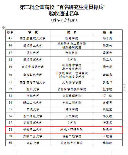近日,教育部办公厅公布第二批全国高校“百名研究生党员标兵”创建培育工作验收结果,我校2018 级环境工程博士研究生张元春顺利通过全国高校“百名研究生党员标兵”验收。