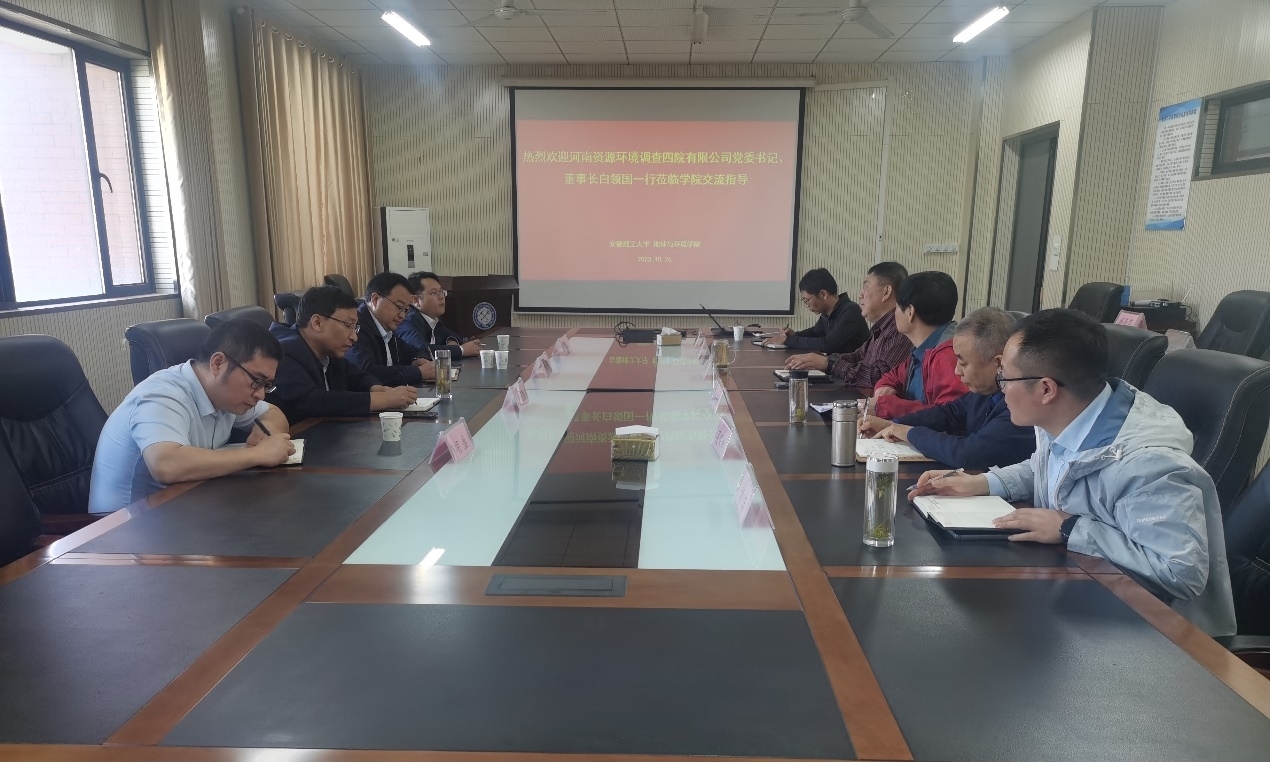 10月26日,河南资源环境调查四院有限公司党委书记、董事长白领国一行来地球与环境学院交流,地球与环境学院教授“大国工匠”朱恒银、院长刘启蒙、副院长吴荣新、张世文出席交流会。会议由刘启蒙主持。