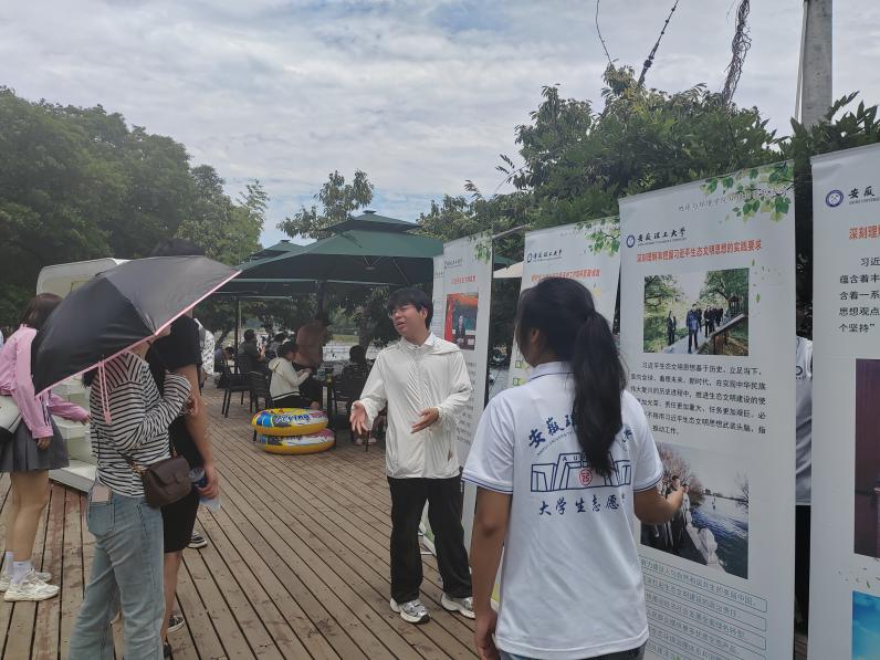 期间团队成员来到泾县桃花潭镇和茂林镇,在这里团队调研绿色发展,实践环保宣传。桃花潭镇和茂林镇是泾县有名的生态小镇,境内绿水青山,美景如画,团队成员通过走访询问,问卷调查,海报展示,采取水样等方式,调研当地绿色发展特色,了解生态产业,积极宣传习近平生态文明思想。