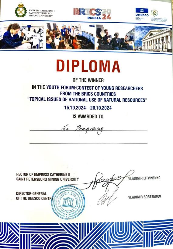 2024年10月15日至20日,由圣彼得堡矿业大学主办,中国矿业大学协办的“矿产资源作为国家主权的基础—人才与创新环境”国际论坛及“自然资源合理利用的热点问题”金砖国家青年学者论坛在俄罗斯圣彼得堡成功召开,学院青年教师李百强博士和许成成博士参会,与国际同行开展学术交流。