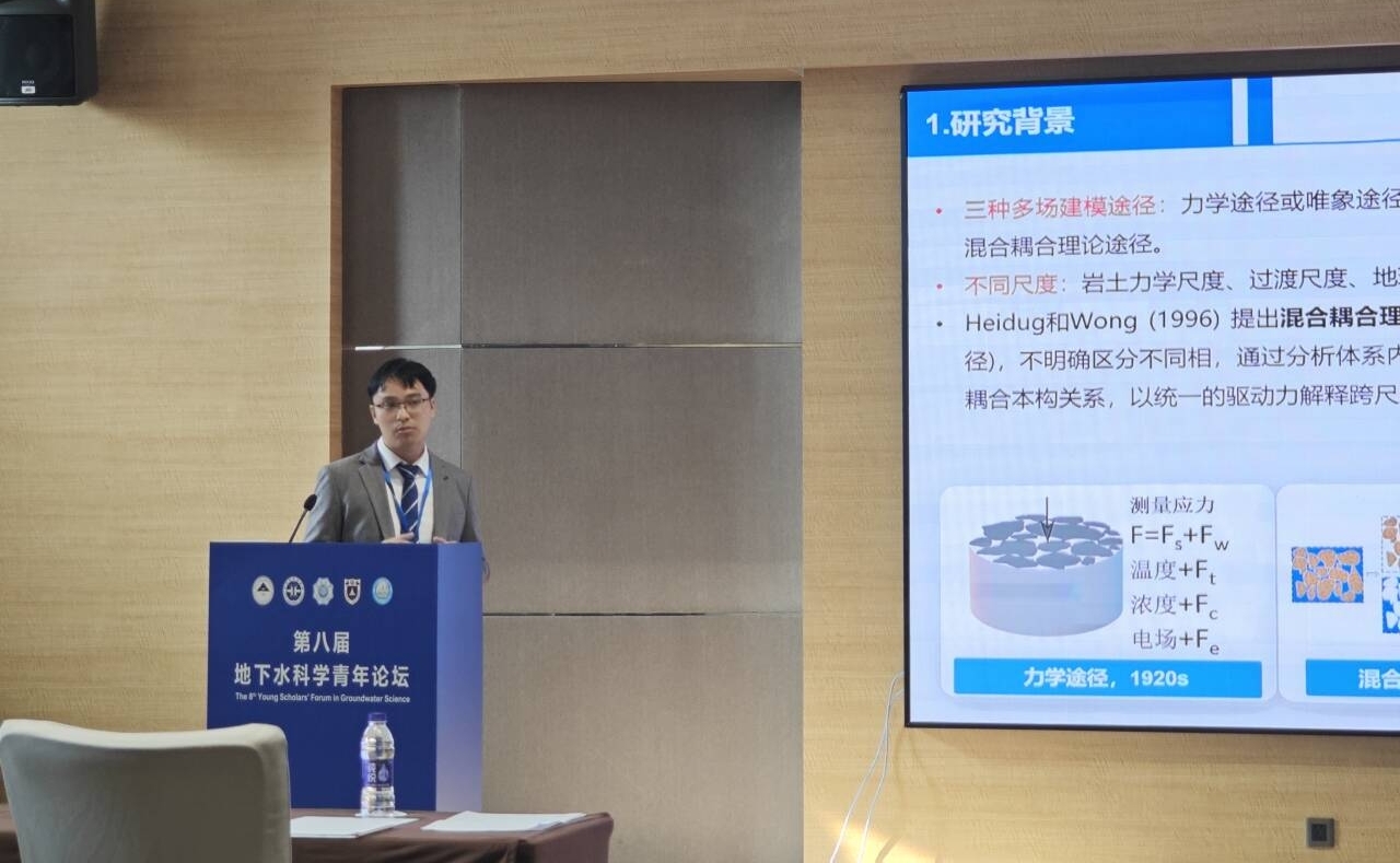 会议期间,学院水科学与工程系教师王锴博士和戴鑫博士分别在不同分会场作题为“基于非平衡热力学的低渗页岩热-渗-力-化耦合建模研究”、以及“季风气候区土壤-地下水系统CO2垂向迁移过程研究”的学术报告。此外,学院博士研究生汪启航作题为“单井注抽试验估算地下水流速的数值模拟与实验研究”的学术报告。上述报告在会场引起与会专家的广泛关注与热烈讨论。