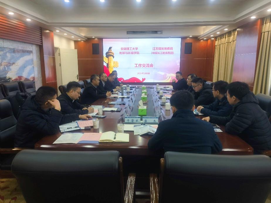 在江苏煤炭质局(中煤长江地质集团),学院一行受到了地质局党委委员、副局长史建勇和集团相关部门负责人、分公司领导的热情接待。史建勇介绍了江苏煤炭地质局发展情况,就各个业务板块人才需求情况以及具体要求做了重点介绍,对能够掌握先进勘探技术并可以熟练驾驭先进地质设备人才表示了迫切需求。贾伟结合学校、学院历史沿革和近年来发展取得的突出成绩,重点介绍了学院专业设置以及学生实践能力培养体系等内容,听取了单位对学院本科生课程设置的意见建议。双方围绕行业发展趋势、人才需求特点展开深入交流,并就共建实习基地、开展科技合作以及人才培养达成初步共识。