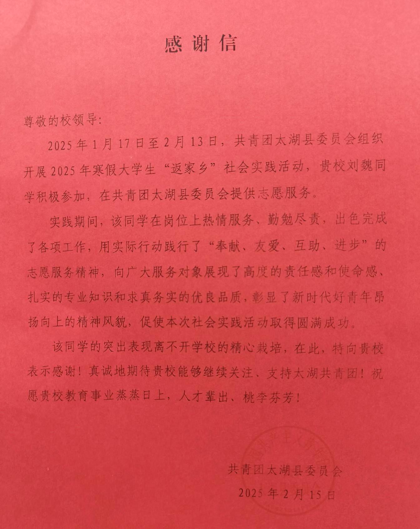 学期伊始,学院收到了一封来自共青团太湖县委员会的感谢信,信中高度赞扬了我院水文与水资源工程2024-1班刘魏同学在寒假期间积极参与太湖县委员会组织和开展的大学生“返家乡”志愿服务活动中的突出表现。她用实际行动诠释了当代大学生的责任与担当,展现了安徽理工大学地球与环境学院学子的优秀品格。在志愿服务期间,刘魏同学始终以饱满的热情和高度的责任感投入工作。无论是社区服务、环境保护,还是关爱弱势群体,她都尽心尽力,用实际行动传递温暖与正能量。她的无私奉献和踏实肯干的精神,赢得了当地群众的一致好评。