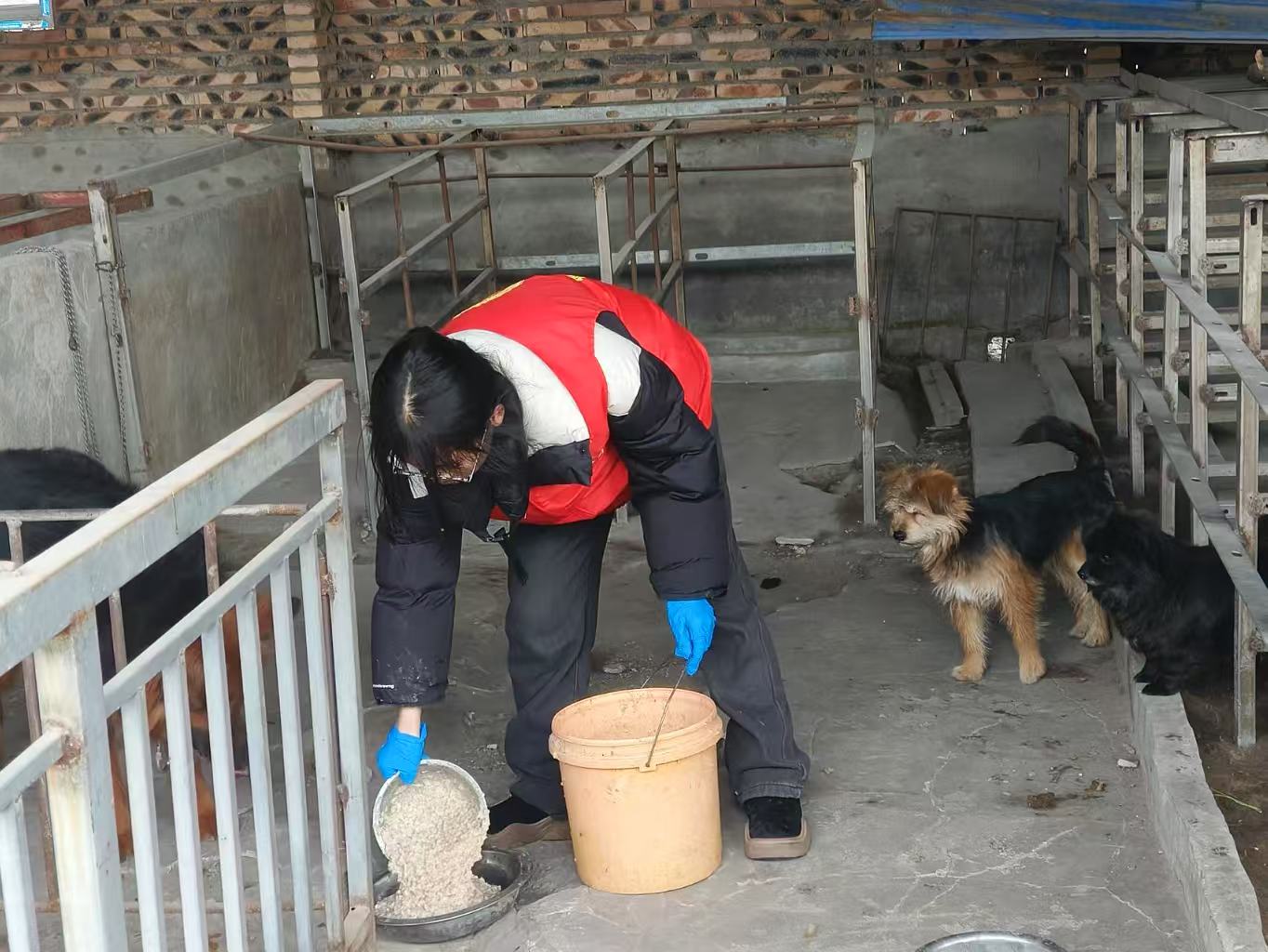 在救助基地,志愿者们在工作人员的指导和帮助下,打扫犬舍、喂食动物,不怕脏、不怕累、用自己的行动帮助流浪动物们改善生活环境。
