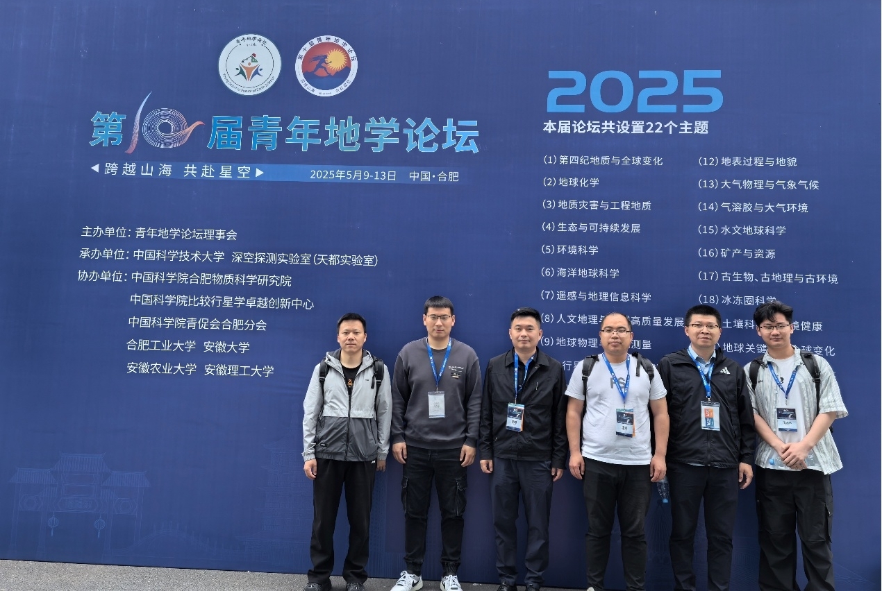 2025年5月9日-13日,第十届青年地学论坛在安徽省合肥市隆重开幕。 本届论坛由青年地学论坛理事会主办,中国科学技术大学、深空探测实验室(天都实验室)承办,中国科学院合肥物质科学研究院、中国科学院比较行星学卓越创新中心、中国科学院青促会合肥分会、合肥工业大学、安徽大学、安徽农业大学、安徽理工大学协办。学院院青年教师姬广忠、文豪、张海涛、李旭、肖鑫、孙斌杨、苏雪雪、王锴、王思诺及研究生共11人参加会议。