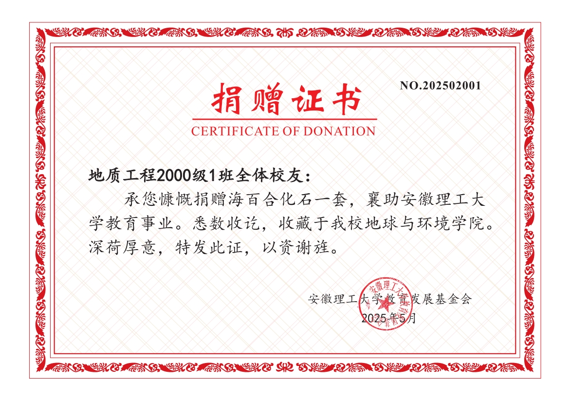 副校长张平松向捐赠发起人,贵州煜滕煤炭行业大数据信息中心有限责任公司董事长、地质工程2000-1班崔玉朝等校友表示真挚感谢。他谈到,化石捐赠体现了校友对母校文化建设和学生培养的支持,展现了校友对母校的深厚情感,希望地环学院发挥化石标本作用,涵养育人文化。崔玉朝表示,值此校庆,饮水思源,希望通过捐赠表达对母校的感恩和祝福之情,祝愿母校根深叶茂,薪火永续。