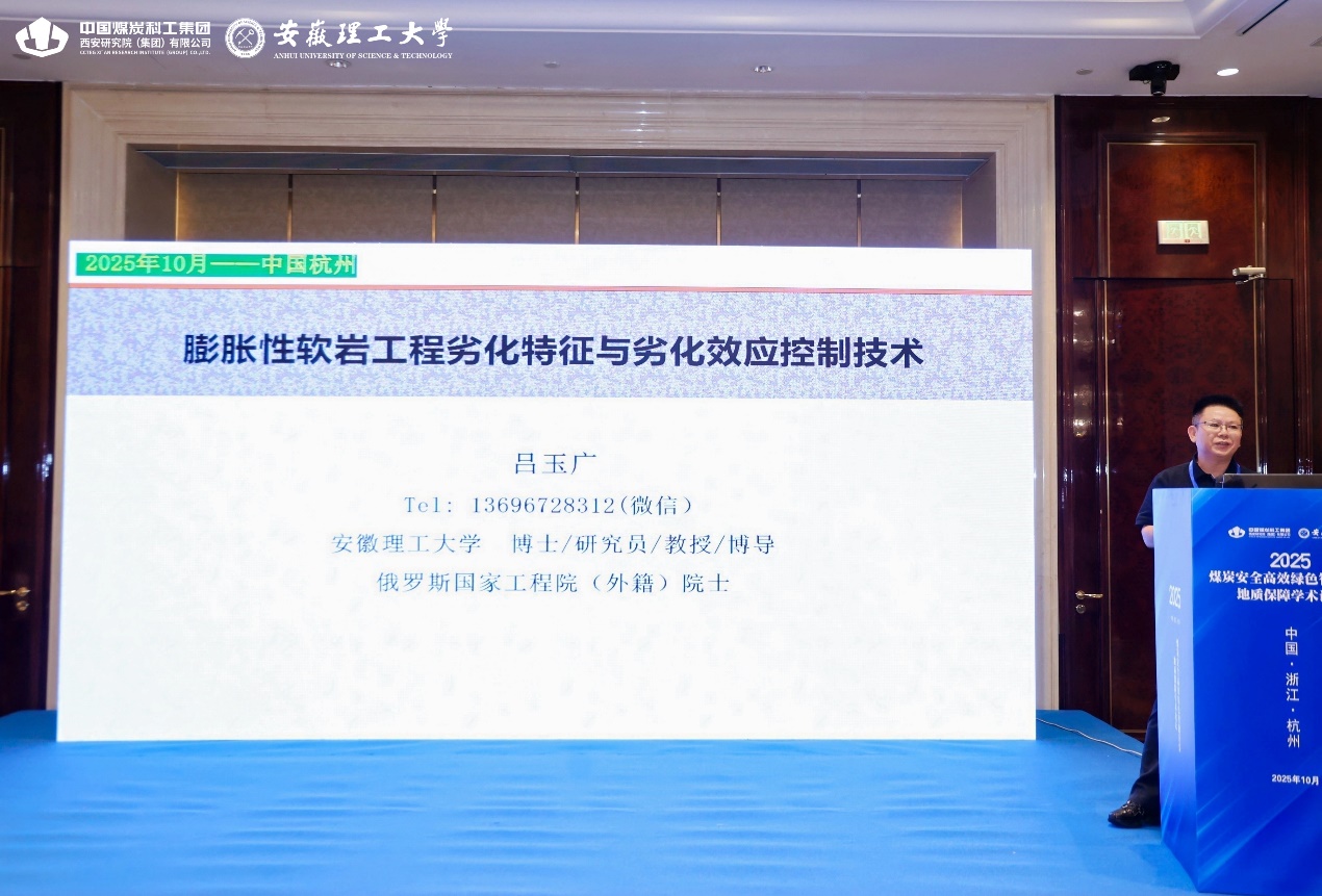 学院刘启蒙院长、吴海波副院长一行5人参加会议。会议期间,刘启蒙受邀担任“水文地质与物探技术”分论坛主持人。吕玉广教授聚焦行业关键技术难题,以“基于水诱因的膨胀性软岩劣化效应与控制技术”为题作分论坛报告。其报告内容紧密结合工程实践需求,提出的技术思路与解决方案获得了与会专家学者的广泛关注与高度认可。