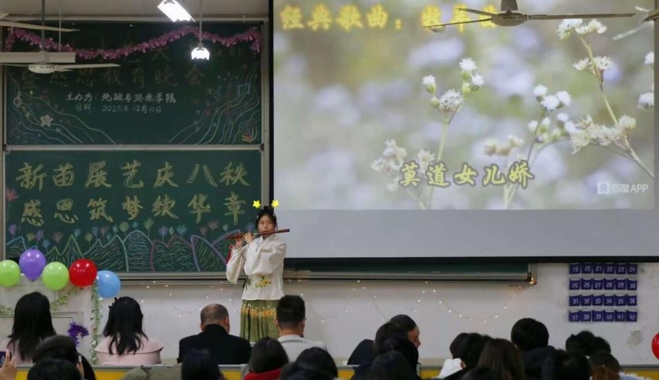 12月10日,地球与环境学院举办“新生才艺大赛决赛暨感恩教育晚会”。晚会以艺术表演为载体,融合感恩教育主题,为2025级新生搭建了才华展示、情感交流的平台。晚会节目形式多样、精彩纷呈,充分展现了新同学积极向上的精神风貌与真挚的情感表达。