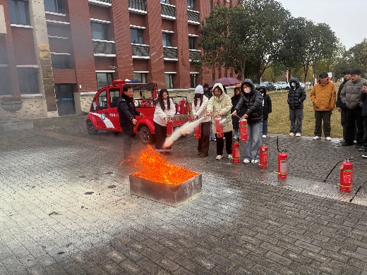 演练结束后,现场开展了灭火器材实操教学。彭广峰为同学们详细讲解了干粉与二氧化碳灭火器分别适用的火灾类型,逐步演示了规范操作要领。在老师的指导下,学生分批进行了实地灭火演练,切实掌握了消防器材的使用技能。