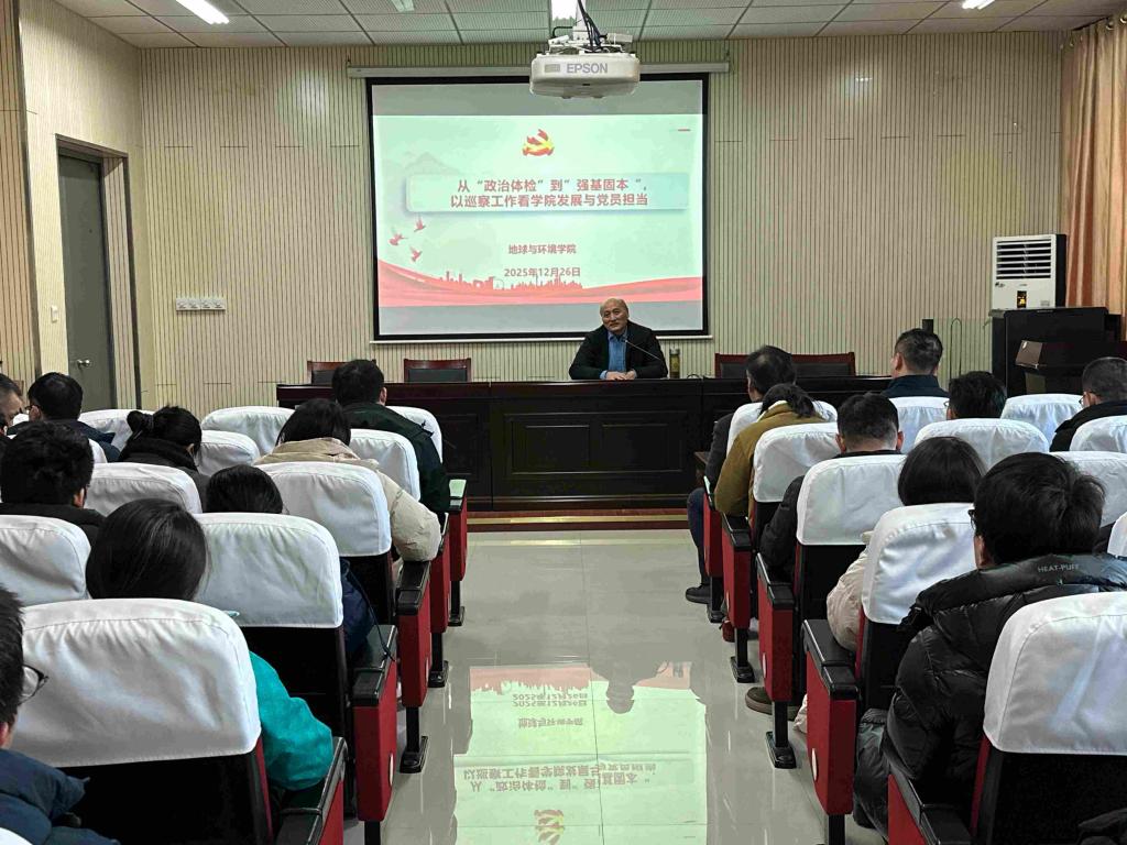 为深入推进全面从严治党向纵深发展、向基层延伸,12月26日下午,地球与环境学院党委在学院B406报告厅举办党员专题培训。学院党委组织员盛鹏飞同志作题为《从“政治体检”到“强基固本”:从巡察工作看学院发展与党员担当》的专题辅导报告。学院领导班子、教师党员参加了本次培训。