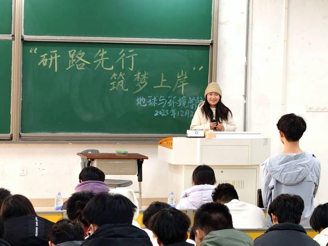 为扎实推进“一站式”学生社区学业支持服务体系建设,助力学生成长成才,地球与环境学院于2025年12月28日在教学楼举办“研路先行,筑梦上岸”研究生推免经验交流会。活动邀请付晋源、曹西发、薛梓贤、陶慧玲四位已推免的2022级同学担任主讲,将优质分享送到学生身边。学院2023级本科生同学参加讲座。
