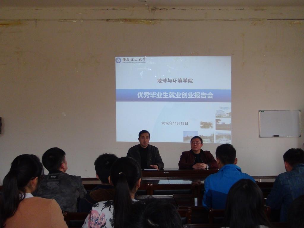 11月13日下午,地球与环境学院邀请地质工程专业2009届优秀毕业生郝志超在学院201会议室举办就业创业报告会。学院党委副书记侯辉主持报告会,2013级地质工程专业学生80余人聆听了报告。