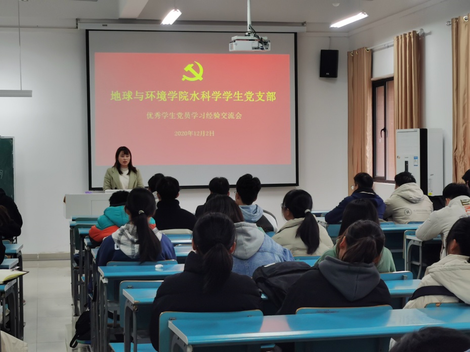 12月2日下午,地球与环境学院水科学学生党支部在静远楼202为2020级学生做学习交流报告会,会议由支部书记魏丹丹主持,支部党员陈情情、高飞、戴钰、徐小倩以及2020级水文专业学生全体学生参加会议。