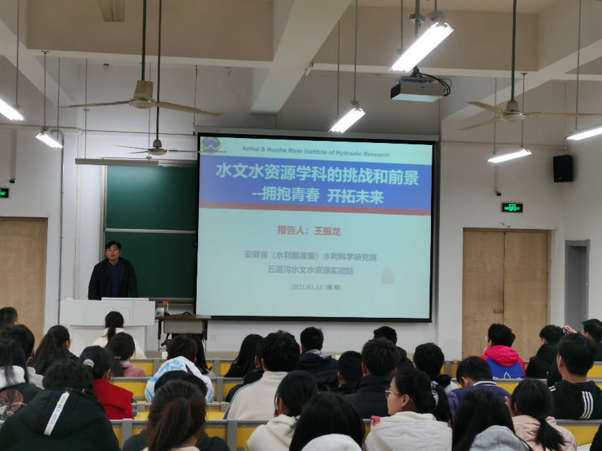 3月18日下午,受自然科学处、地球与环境学院的邀请,安徽省(水利部淮委)水利科学研究院水文水资源研究所所长王振龙教授级高工来校进行学术交流。在天工楼203教室,王教授为我校水文水资源和地下水学科的师生做了题为《水文水资源学科的挑战和前景-拥抱青春,开拓未来》的学术讲座,报告会由地球与环境学院副院长吴荣新教授主持。