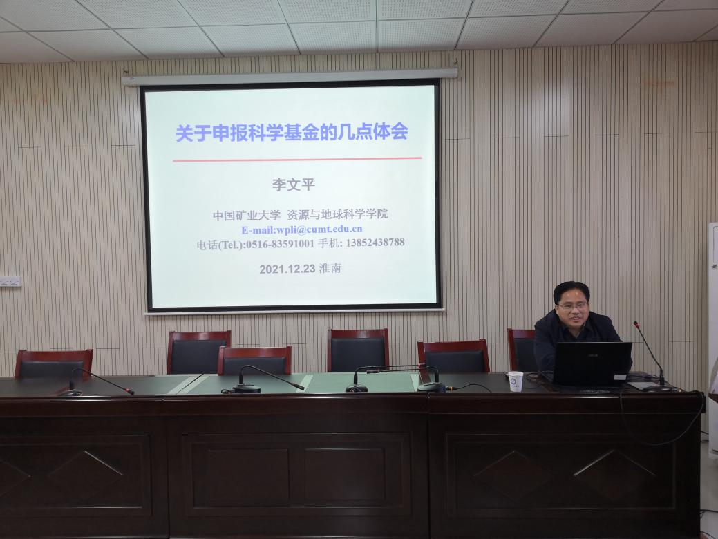 12月23日,中国矿业大学李文平教授应邀在静远楼B406报告厅作了题为“关于申报科学基金的几点体会”的学术报告。来自地球与环境学院的40余名教师聆听了报告,报告会由地球与环境学院院长刘启蒙主持。
