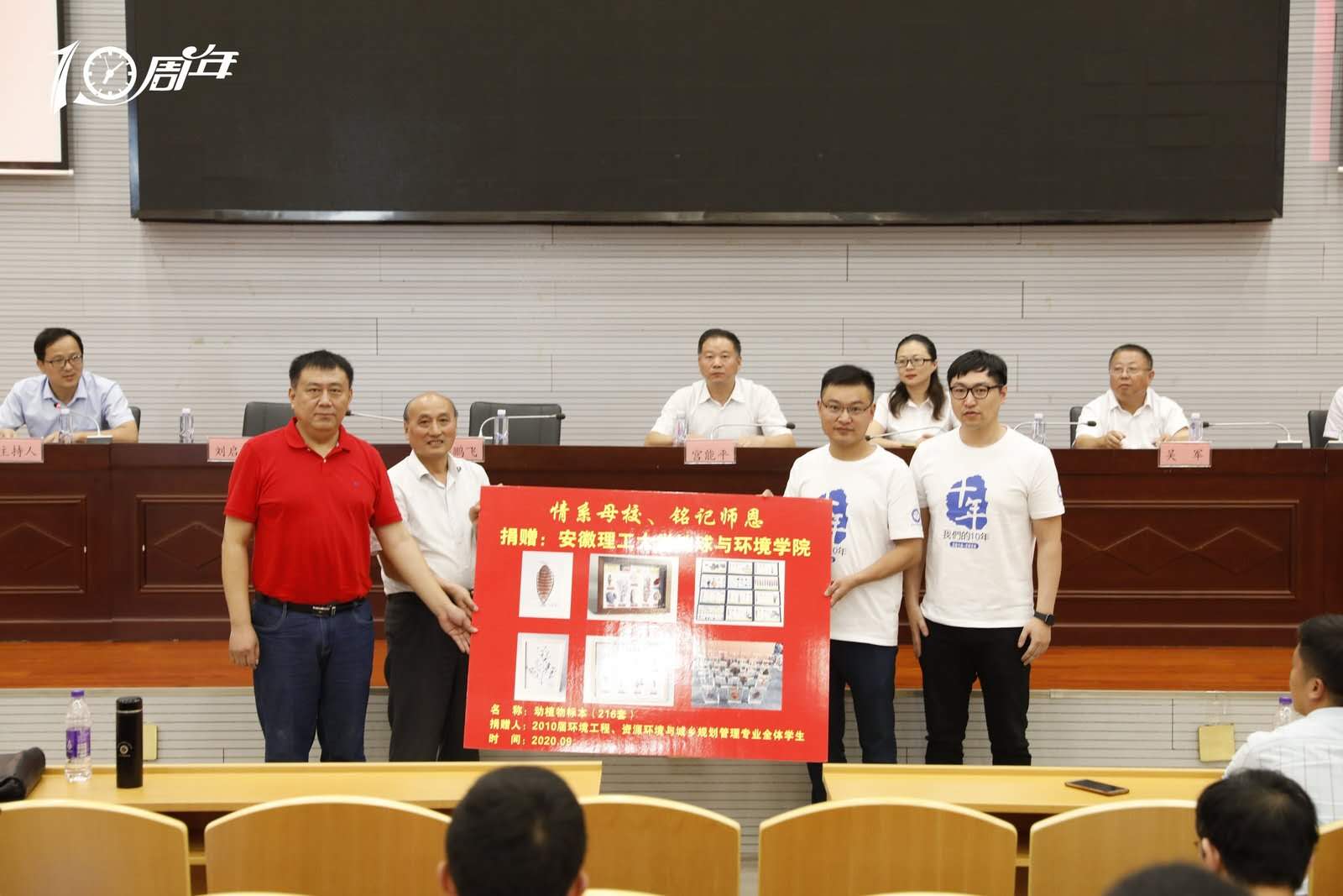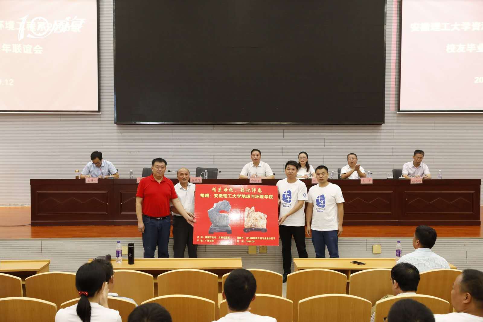 地球与环境学院党委书记盛鹏飞代表两个学院致欢迎词,向校友们介绍了两个学院发展过程中的历史渊源,结合母院十几个“第一”和“首个”标志性事件或人物,介绍了学院建设发展的历程、取得的成绩以及传承的文化精神。地球与环境学院副院长(主持工作)刘启蒙和空间信息与测绘工程学院院长赵志根分别在座谈交流时介绍了学院学科建设、人才培养、师资队伍、对外交流等发展现状。来自各专业的校友代表分别汇报交流了专业同学十年以来的学习、工作和生活情况,表达了对母校和师长深深的思念与感恩之情,并为母校捐赠了一座珊瑚石灰岩、一座方解石晶族、216套动植物标本和一座北斗科教模型。