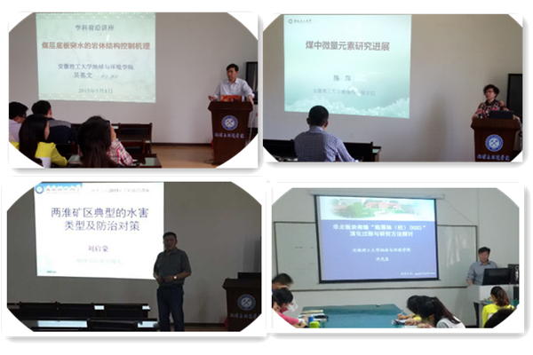 刘启蒙教授在《两淮矿区典型的水害类型及防治对策》报告中,对安徽省煤炭资源概况进行阐述,结合两淮矿区水文地质条件,对安徽矿区典型的水害类型及其特征进行分析,讨论了相应的防治对策。吴基文教授在《煤层地板突水的岩体结构控制机理》中,对煤矿突水机理,矿井五大灾害和突水状况进行分析,重点讨论了底板突水的岩层结构控制,煤层底板采动效应的岩体结构控制机理,以及控制技术参数选取等内容。陈萍教授做了题为《煤中微量元素研究进展》的学术报告,结合目前我国煤炭资源的分布与利用,分析了现阶段能源消费结构以及煤炭产能状况。结合所承担的973课题,对煤中微量元素及其研究意义等进行阐述,重点分析了重庆南桐煤田、鄂尔多斯盆地与沁水盆地等地微量元素的研究成果。谢焰教授做了题为《浅水湖泊水上煤田钻探施工技术》的学术报告。结合工程实例分析水上钻探技术的必要性,以及国内外水上勘探研究现状和国内煤田水上探查研究特征。重点介绍了沉塔法施工的步骤与塔基的布置,以及水上钻探环境保护等方面内容。刘少敏副教授在题为《城市固体废物资源现状及其在水处理中的应用》的报告中,介绍了城市固体废物的来源及现状,重点讲解了废弃秸秆和粉煤灰在水处理中的应用,废弃矿石改性后用作吸附催化材料以及壳聚糖与海泡石的共吸附作用,并对废弃资源处理废水的应用前景做了展望。许光泉教授作了题为《华北板块南缘“陷落体(柱)(KCC)”演化过程与研究方法探讨》的报告,结合中国和美国部分地区不同的地质构造,介绍了陷落体(柱)分布与影响因素,包括碳酸盐的矿物成分及结构,多期的地质构造运动以及多期的地下水流作用。并对华北板块陷落体(柱)形成机制、演化过程,以及研究现状、存在问题进行阐述。