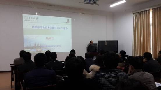 姚素平教授首先表达了对母校培养的感激之情,欢迎我校学生多去南京大学求学深造。随后,姚教授分“非常规油气地质特征、美国页岩气革命的发展历程、科技进步在页岩气革命中的作用、中国页岩气资源发展前景和中国页岩气勘探开发面临挑战与对策”五大方面内容,系统地阐述了非常规油气勘探开发过程及其特点,重点结合地质认识、水平钻井、水力压裂、储层描述等创新技术讨论了页岩气勘探开发近200年来的成果,通过北美及我国页岩气资源对比、勘探开发历程比较,以丰富详实的数据和事例向我们展示了我国页岩气开发利用的巨大前景,同时客观地分析了未来页岩气勘探开采过程中所面临的挑战并讨论了解决策略。